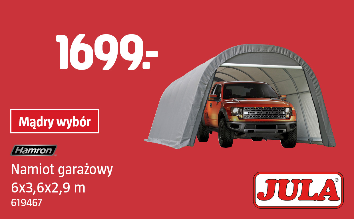 Bardzo praktyczny namiot, który nadaje się do krótko- i długotrwałego przechowywania samochodu, łodzi, drewna opałowego itp. Szkielet namiotu stanowi rama rurowa lakierowana proszkowo (42×1 mm), pokryta mocną, odporną na promieniowanie UV plandeką wykonaną z polietylenu (200 g/m²). Więcej o namiocie znajdziesz pod linkiem: Namiot garażowy 6×3,6×2,9 m | Hamron | Jula